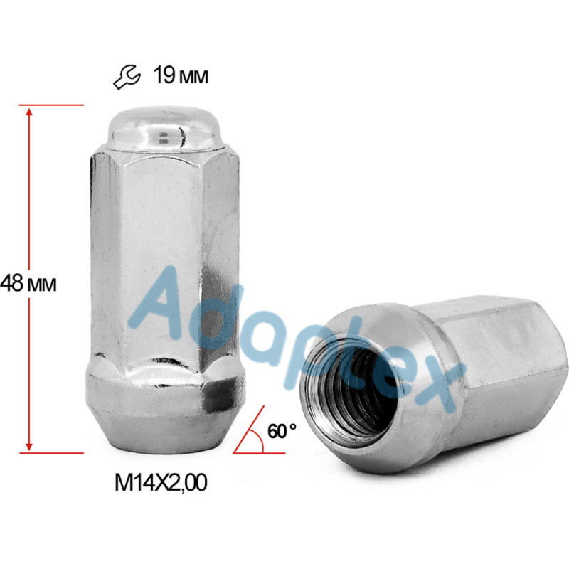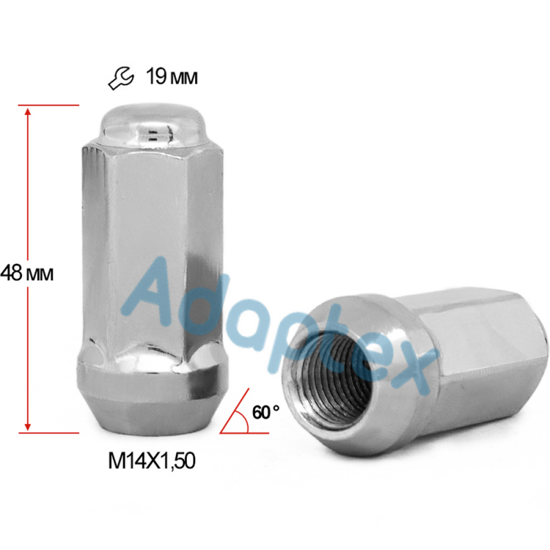 Гайка колесная М14x1,5x48мм Конус (Chevrolet, Ford, Dodge, Ssang Yong, УАЗ) Хром Ключ 19