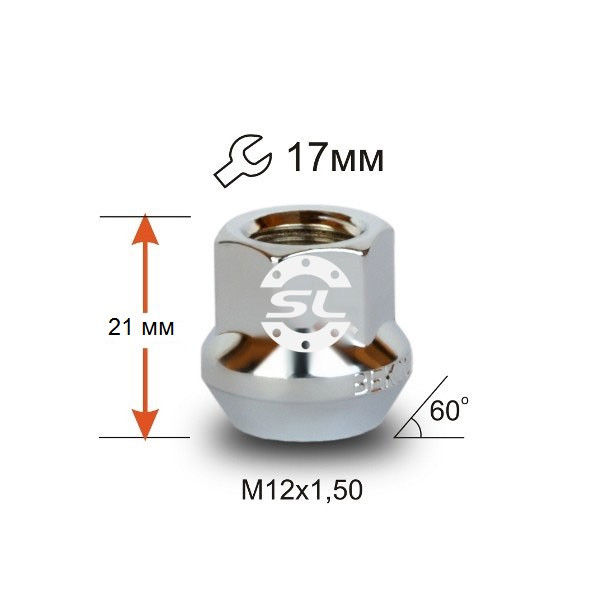 Гайка колесная М12x1,5x21мм Конус Ключ 17 (под железные диски)