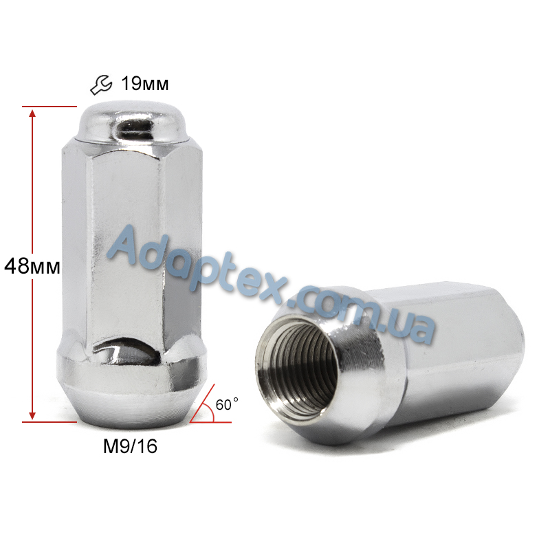 Тип Гайка Резьба 9/16 Высота гайки (мм) 48 Прижимная поверхность Конус Покрытие Хром Ключ 19 Цвет Хромированный Материал Сталь Производитель GETMANN