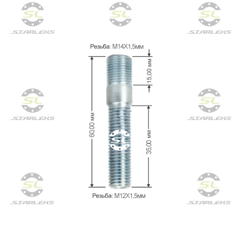Колесная шпилька резьбовая М14x1,5x15мм/М12x1,5x35мм (Общая длина 60мм)