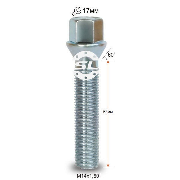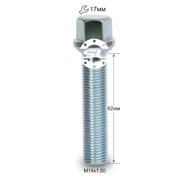 Болт колесный М14x1.5x62мм Сфера Цинк Ключ 17 (Audi, Seat, Skoda, Volkswagen) Удлиненный
