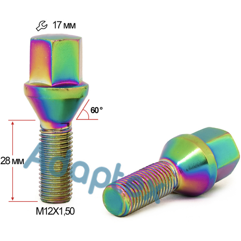 | Болт колесный М12x1.5x28мм Конус (BMW, Daewoo, Opel, Renault) Радужный титан Ключ 17 (под литые диски) |