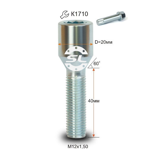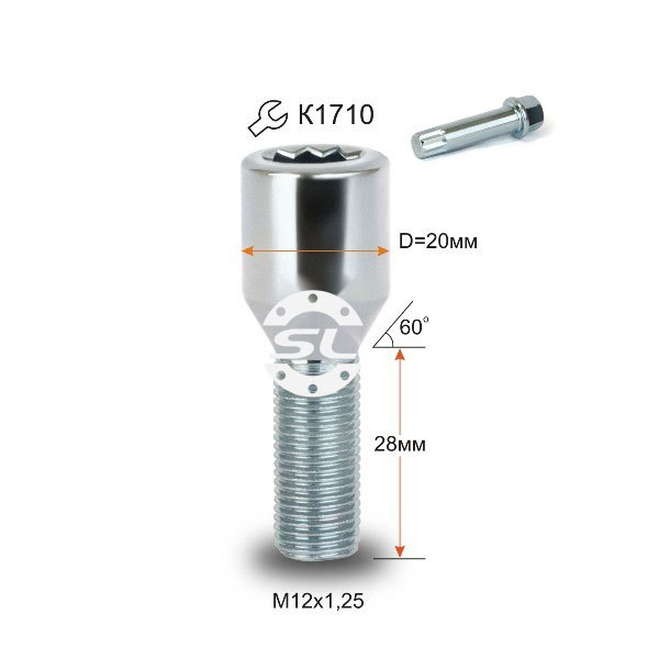 | Болт колесный М12x1.5x60мм Сфера Цинк Ключ 17 (Audi, Mercedes-Benz, Seat, Skoda, Volkswagen) Удлиненный |