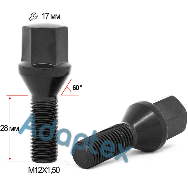 Болт колесный М12x1.5x28мм Конус (BMW, Daewoo, Opel, Renault) Чёрный Хром Ключ 17 (под литые диски)