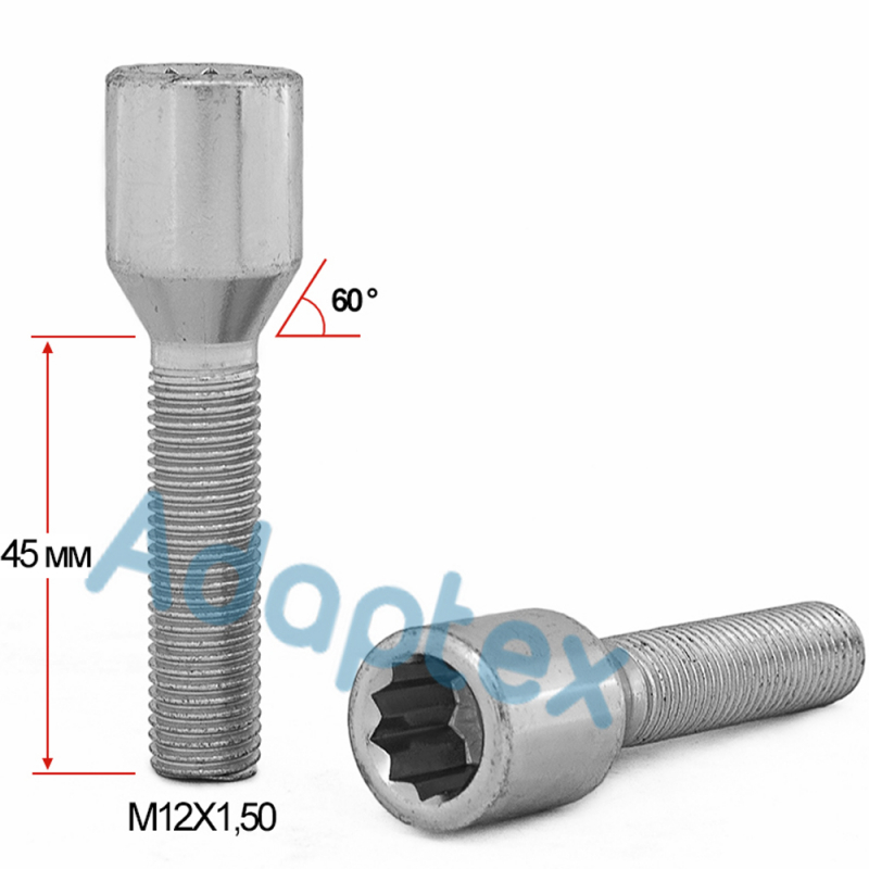 Болт колесный под внутренний 10-гранник М12x1.5x45мм Конус для узких отверстий в диске (Удлиненный)